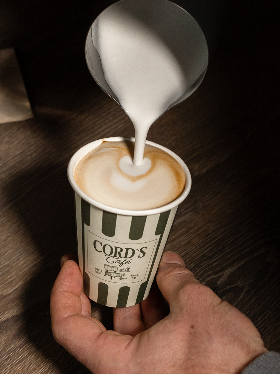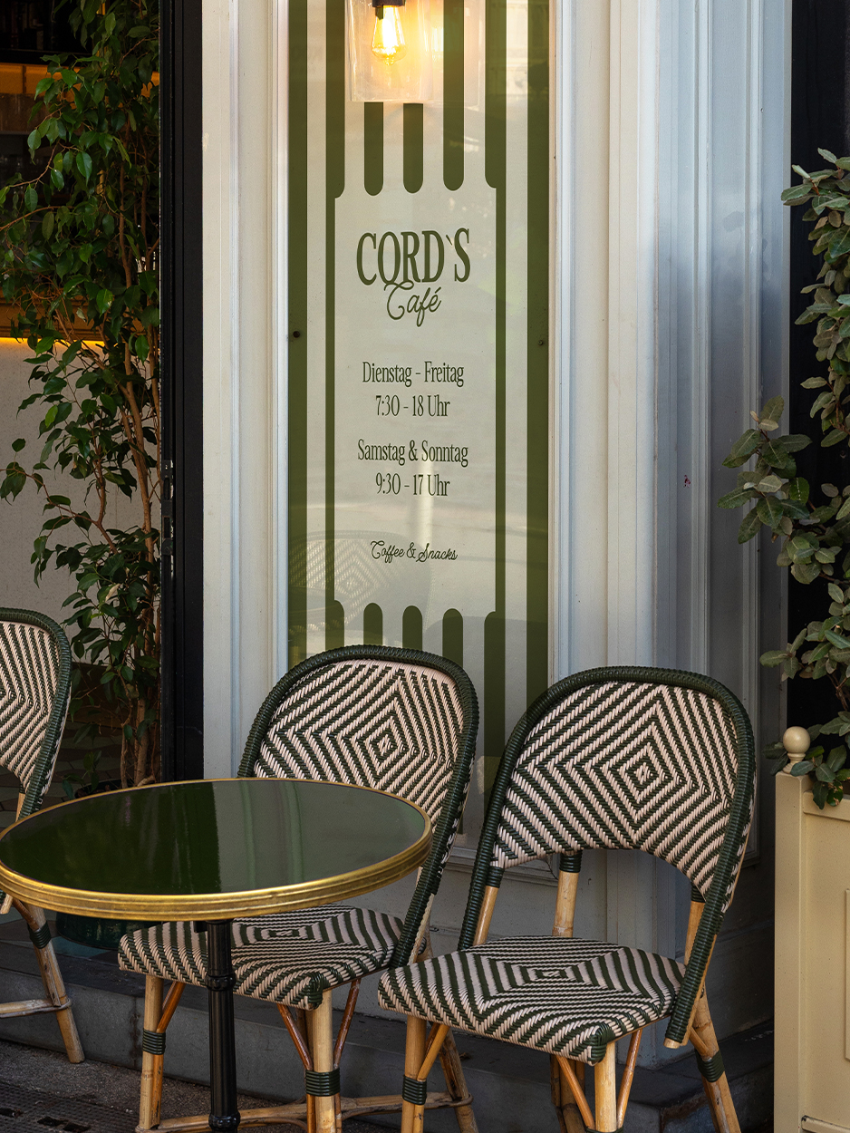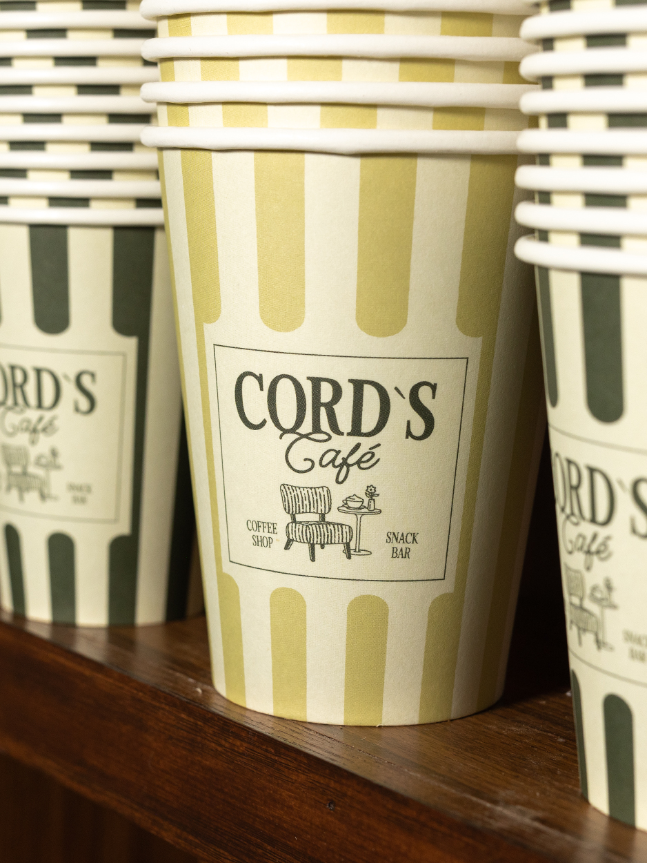 Cord's Café is a coffee shop based in Germany. The name Cord plays an important role in our brand identity. It stands for the founder's grandfather and conveys the deeper idea of caring for customers' food and traditions. The entire coffee shop is furnished with corduroy fabric. This inspired us to develop a vintage look with personality. A cursive logotype gives the brand a personal touch. Individually drawn illustrations reflect craftsmanship and quality. The corduroy pattern is reflected in all brand assets in the form of stripes.