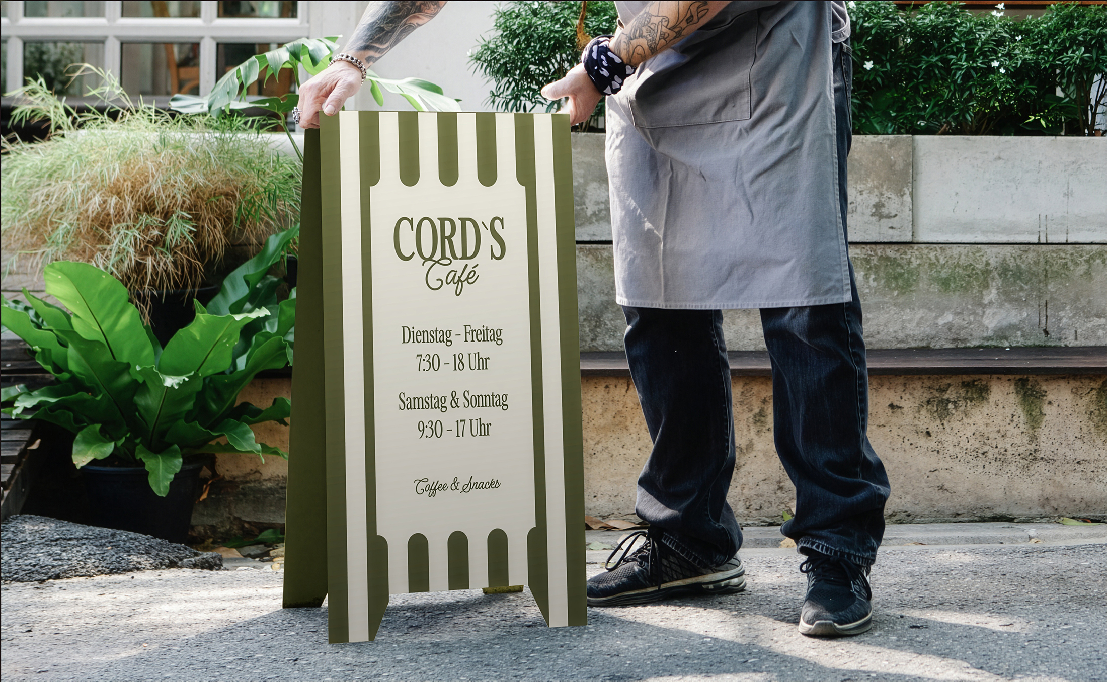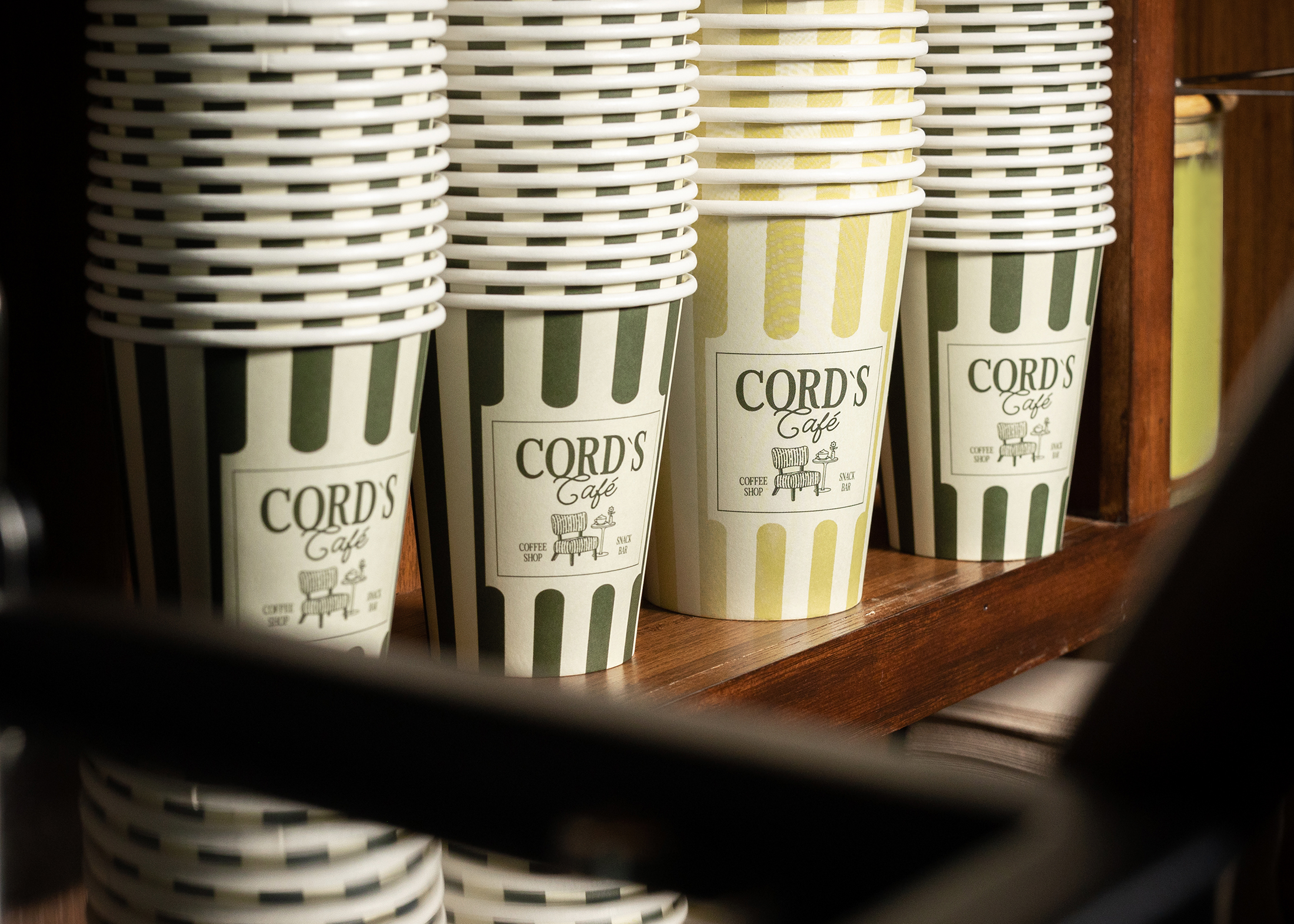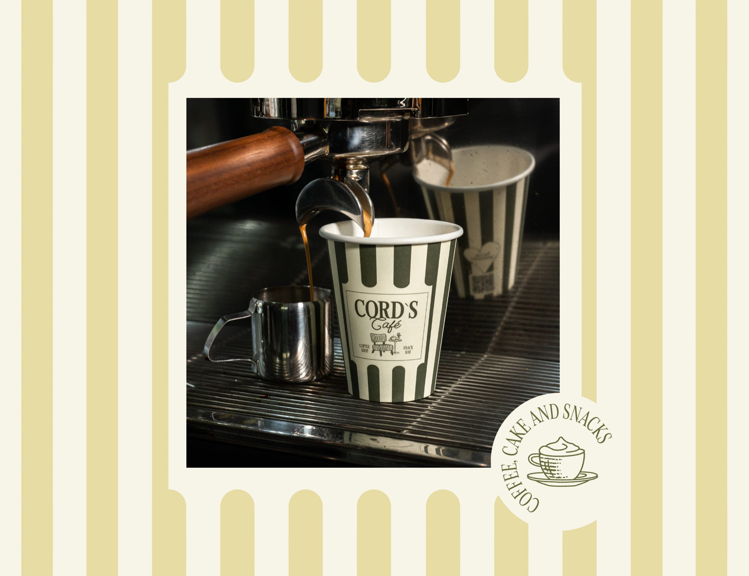 Cord's Café is a coffee shop based in Germany. The name Cord plays an important role in our brand identity. It stands for the founder's grandfather and conveys the deeper idea of caring for customers' food and traditions. The entire coffee shop is furnished with corduroy fabric. This inspired us to develop a vintage look with personality. A cursive logotype gives the brand a personal touch. Individually drawn illustrations reflect craftsmanship and quality. The corduroy pattern is reflected in all brand assets in the form of stripes.